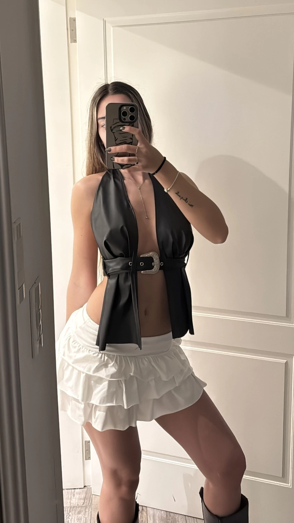 Un top de eco-cuero con escote profundo y diseño halter, que ajusta en la cintura con un cinturón metálico que marca la silueta y le da un toque sofisticado y audaz. Su caída estructurada lo convierte en una prenda statement, ideal para combinar con minis, jeans o pantalones sastreros para lograr un look poderoso y elegante.