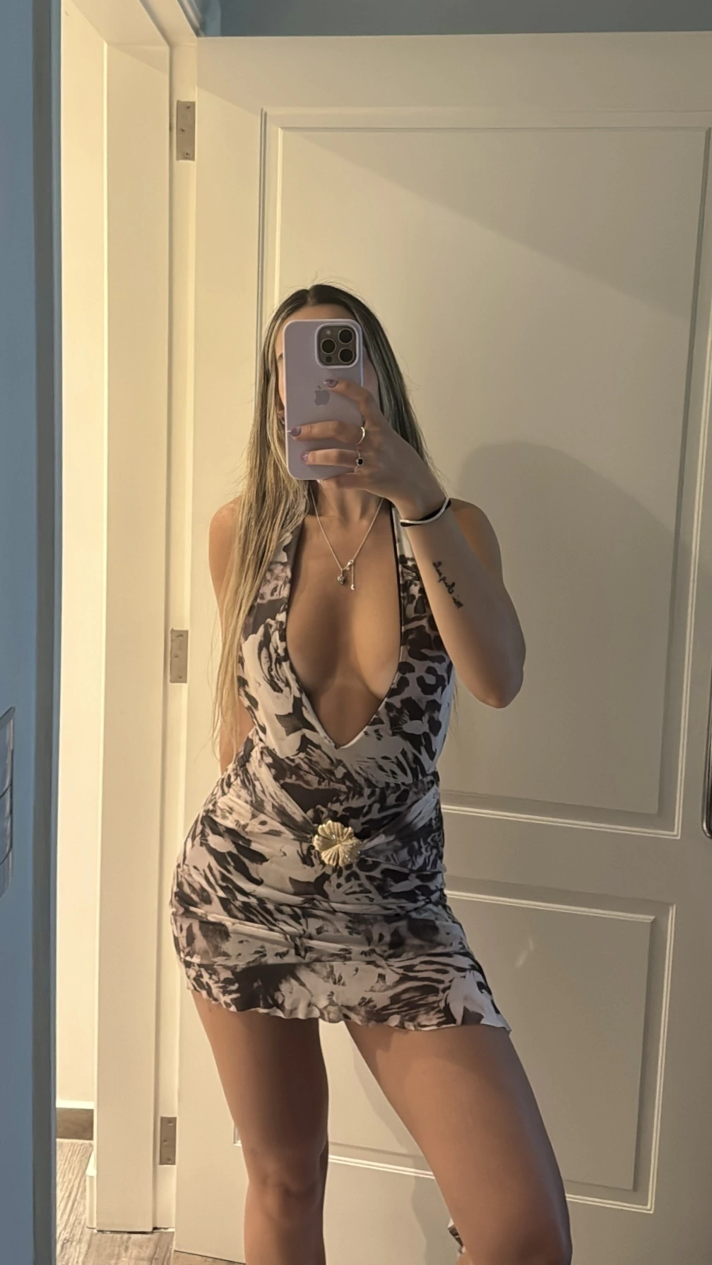 Tiene espalda completamente descubierta, un ruedo con movimiento y estampa en tonos neutros que lo hace único, elegante y sexy a la vez.